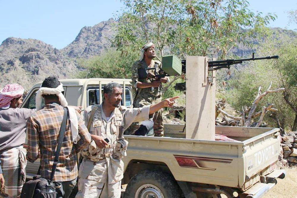 قوات من الجيش الوطني أثناء مواجهات مع الانقلابيين غرب تعز، أمس. (إعلام الجيش)