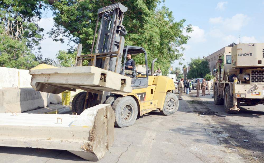 القوات العراقية أثناء إزالة الحواجز الخرسانية تحسباً لإعادة فتح جزئي للمنطقة الخضراء شديدة الحراسة في العاصمة بغداد، أمس. (أ. ف. ب)