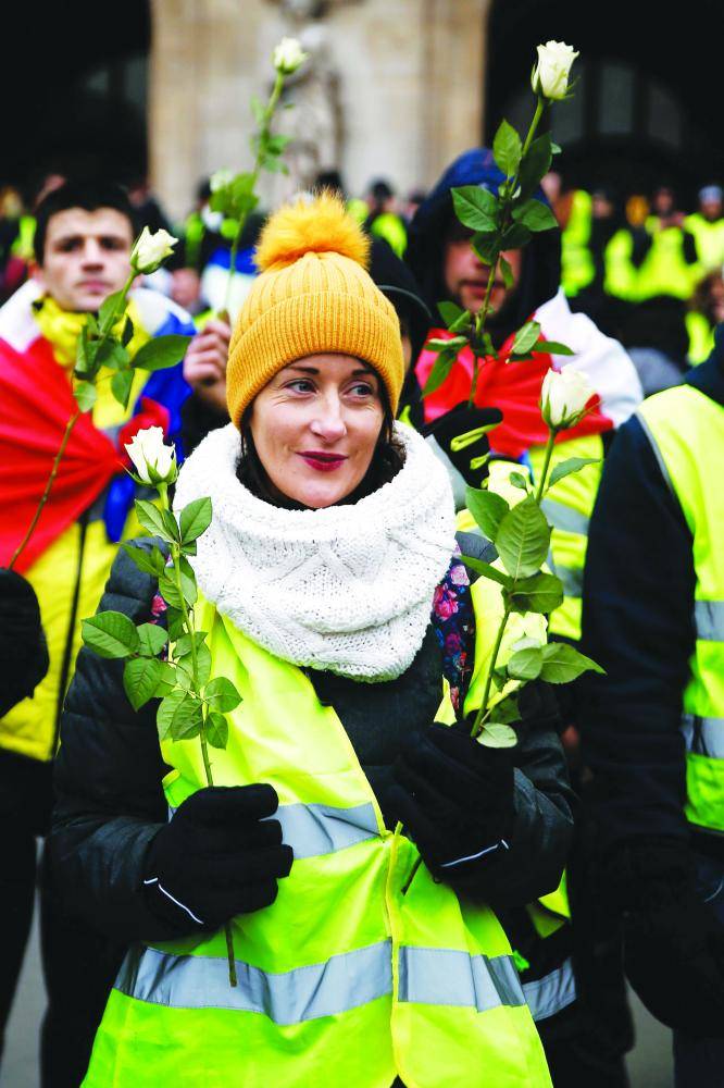 لـ (السبت) الخامس على التوالي تمسك أصحاب «السترات الصفراء» بمواصلة احتجاجاتهم في فرنسا أمس، لكن بإعداد أقل من الأسبوع الماضي، إلا أنها تشكل اختبارا للرئيس إيمانويل ماكرون الذي يواجه صعوبة في احتواء الغضب رغم سلسلة التنازلات التي قدمها. وإذا كانت الطبيعة السلمية غلفت احتجاجات الأمس، إلا أن سقف مطالب المحتجين قد ارتفع هذه المرة. وقال جيريمي (28 عاما) القادم من مدينة رين (غرب) «المرة الأخيرة تجمعنا من أجل الرسوم، هذه المرة جئنا من أجل المؤسسات: نريد مزيدا من الديموقراطية المباشرة». وأضاف «يجب أن نصرخ ليسمع صوتنا». فيما دعا أحد محتجي «السترات الصفراء» كريستوف شالانسون الذي يعد من الممثلين «البنائين» في الحركة، إلى «مزيد من الحزم» وقرر التظاهر «حتى استقالة» الرئيس.