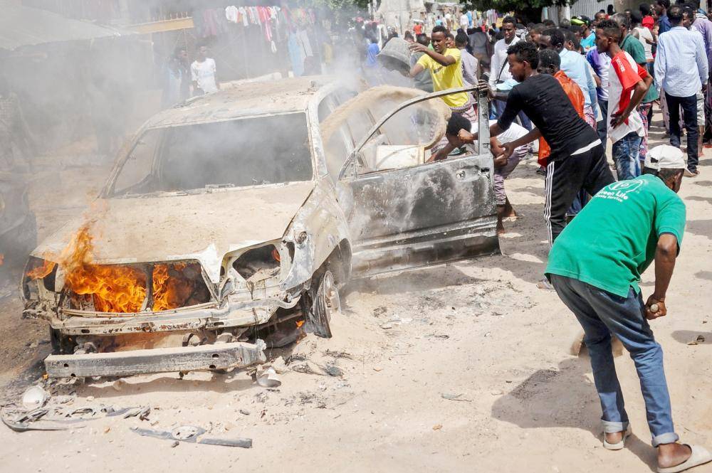صوماليون يحاولون إخماد النيران بعد انفجار سيارة مفخخة في العاصمة مقديشو، أمس الأول. (أ.ف.ب)
