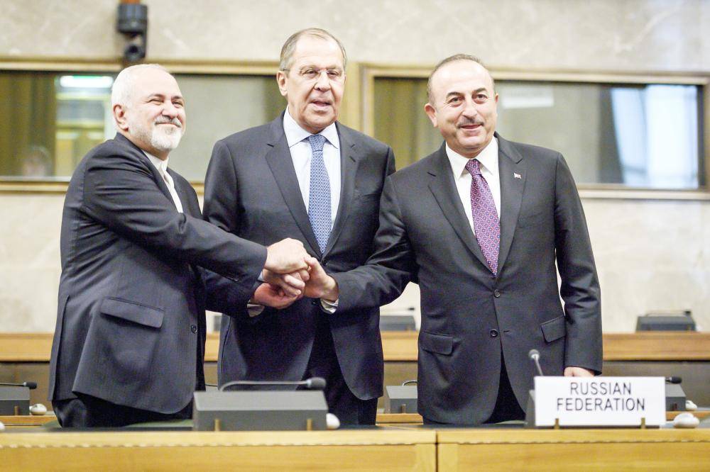 وزراء خارجية روسيا وتركيا وإيران بعد الاتفاق على اللجنة الدستورية لسورية. (أ ف ب)