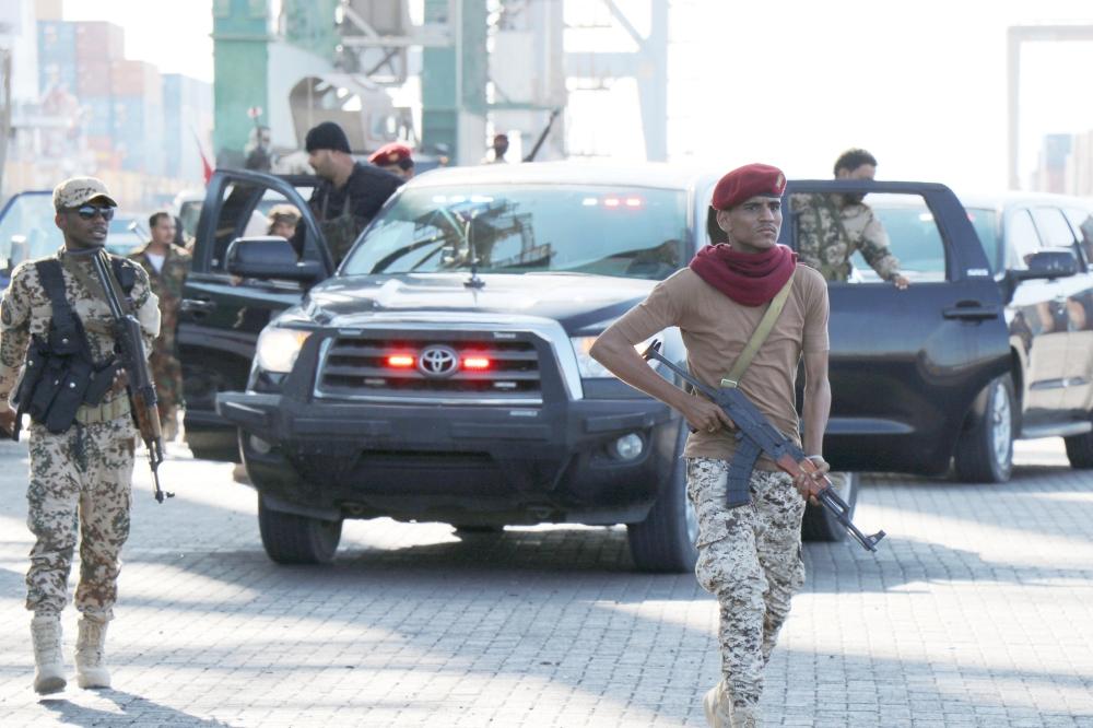 جنود يرافقون مسؤولين حكوميين يقومون بجولة في محطة الحاويات في ميناء عدن (رويترز)