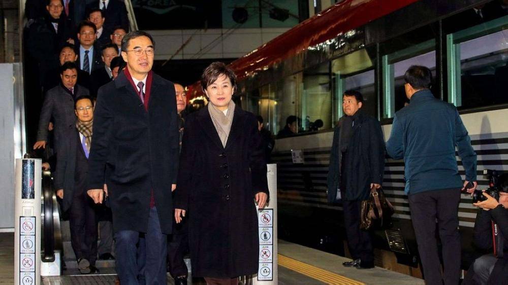 وزير التوحيد الكوري الجنوبي تشو ميونغ جيون، ومسؤولون يصلون إلى القطار للمغادرة إلى كوريا الشمالية في محطة سكة حديد سيول.