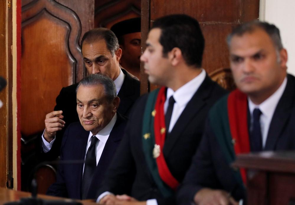 ورافق مبارك في جلسة المحاكمة اليوم نجلاه علاء وجمال.