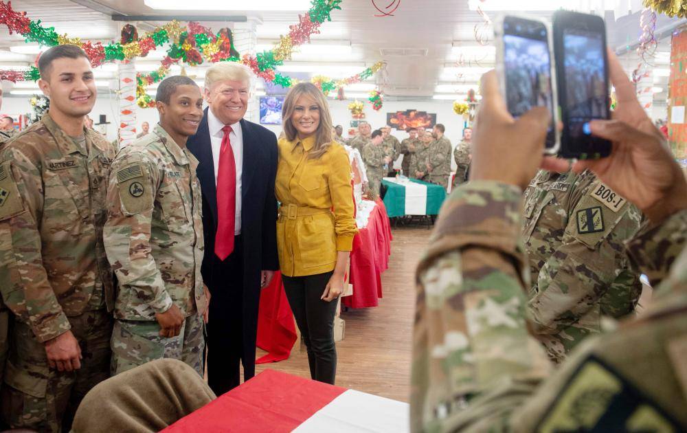 الرئيس ترمب خلال التقاط صور تذكارية بمعية زوجته مع الجنود الأمريكيين في قاعدة الأسد في العراق أمس. (أ. ف. ب)