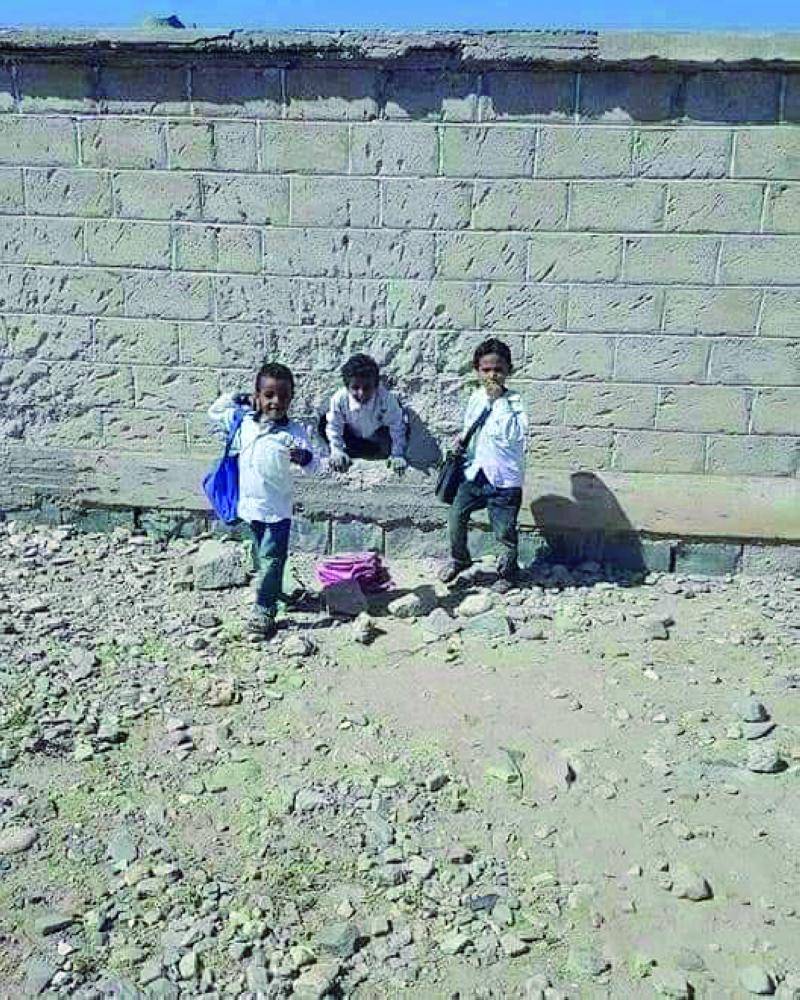 أطفال يمنيون يغادرون عبر نافذة في مدرستهم التي تضررت بقصف حوثي جنوب الحديدة أمس . (إعلام الجيش)