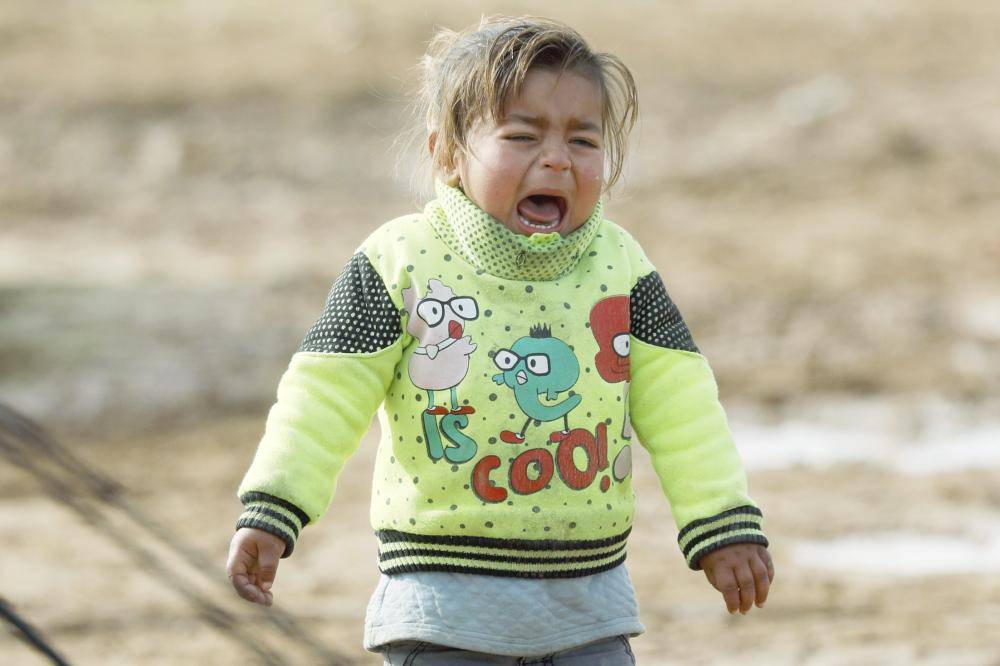 طفلة سورية تبكي من شدة البرد في مخيم للنازحين بدير الزور أمس الأول. (أ ف ب)