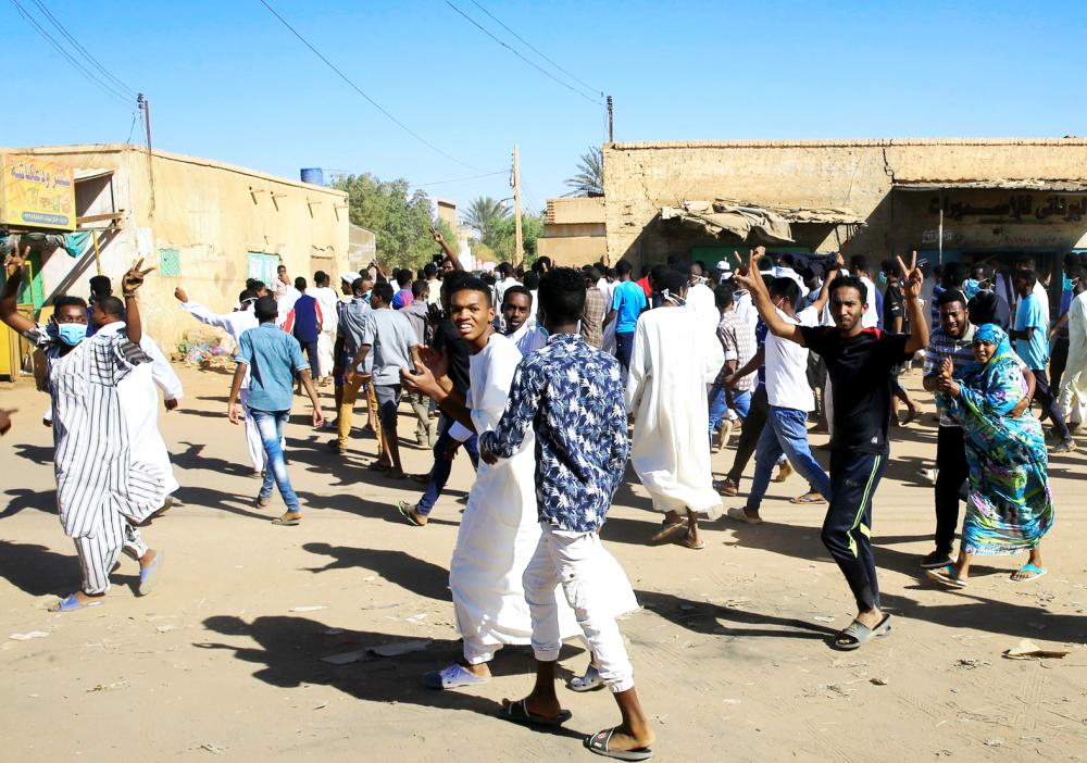 متظاهرون سودانيون خلال مسيرة مناهضة للحكومة بعد صلاة الجمعة في الخرطوم أمس الأول. (رويترز)