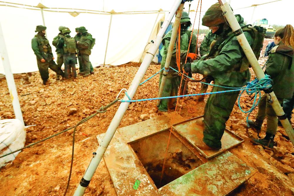 جنود الاحتلال الإسرائيلي أثناء الكشف عن نفق على الحدود اللبنانية. (أ. ف. ب)