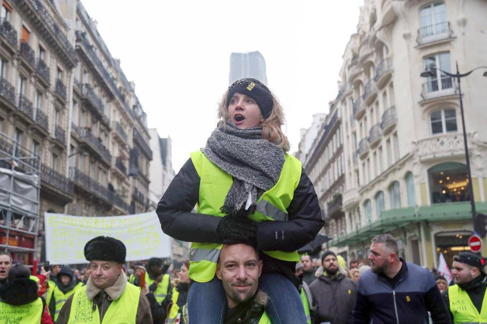 احتشد محتجو «السترات الصفراء» في باريس (السبت) العاشر على التوالي ضد حكومة الرئيس إيمانويل ماكرون، وسط مخاوف من حدوث أعمال عنف، على رغم بدء ماكرون «النقاش الكبير» الذي لا يبدو أنه هدأ غضب المحتجين. وبدأ المحتجون في الاحتشاد بمحاذاة الشانزليزيه وقرب مجلس النواب وبرج إيفل. وردد بضع عشرات من المتظاهرين «ماكرون استقل». وقالت المتظاهرة صوفي تيسييه: «ماكرون لا يسمع ولا يفهم شيئا مما يحدث، ونحاول أن نجعله يفتح عينيه. هناك معاناة إنسانية حقيقية». وشكل عدد المتظاهرين مؤشرا على فاعلية «النقاش الوطني الكبير» الذي أطلقه ماكرون لتطويق أسوأ أزمة اجتماعية منذ انتخابه في 2017. وتوقع مصدر أمني حدوث تعبئة تعادل في حجمها على الأقل تعبئة الأسبوع الماضي. وأضاف المصدر الأمني أنه أطلقت دعوات للمتظاهرين باستهداف قوات الأمن. وشهدت التجمعات السابقة بعض الصدامات العنيفة أحيانا. وشوهت مشاهد عنف في باريس طافت العالم صورة فرنسا كأبرز وجهة سياحية عالمية.
