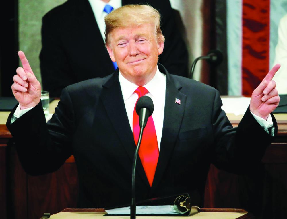 ترمب يلقي خطاب «حالة الاتحاد» خلال جلسة مشتركة للكونغرس في الكابيتول هيل أمس. (رويترز)