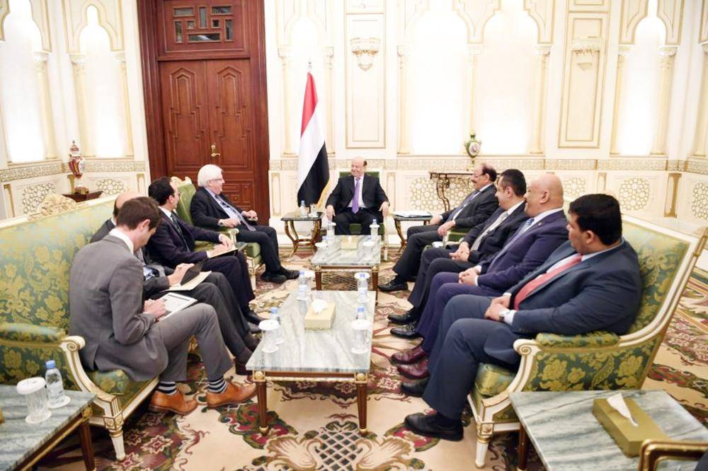 هادي وقيادات حكومية أثناء لقاء غريفيث في الرياض أمس. (سبأ)