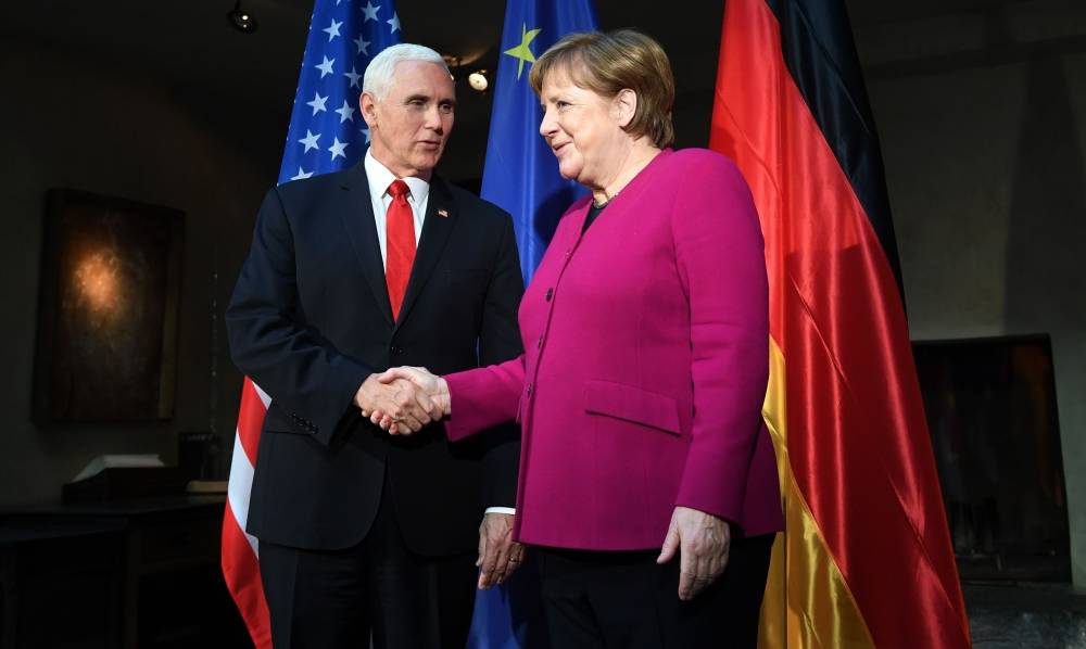 German Chancellor Angela Merkel (R) shakes hands with US Vice President Mike Pence during a photo call at the 55th Munich Security Conference in Munich, southern Germany, on February 16, 2019. The 2019 edition of the Munich Security Conference (MSC) takes place from February 15 to 17, 2019. / AFP / Christof STACHE