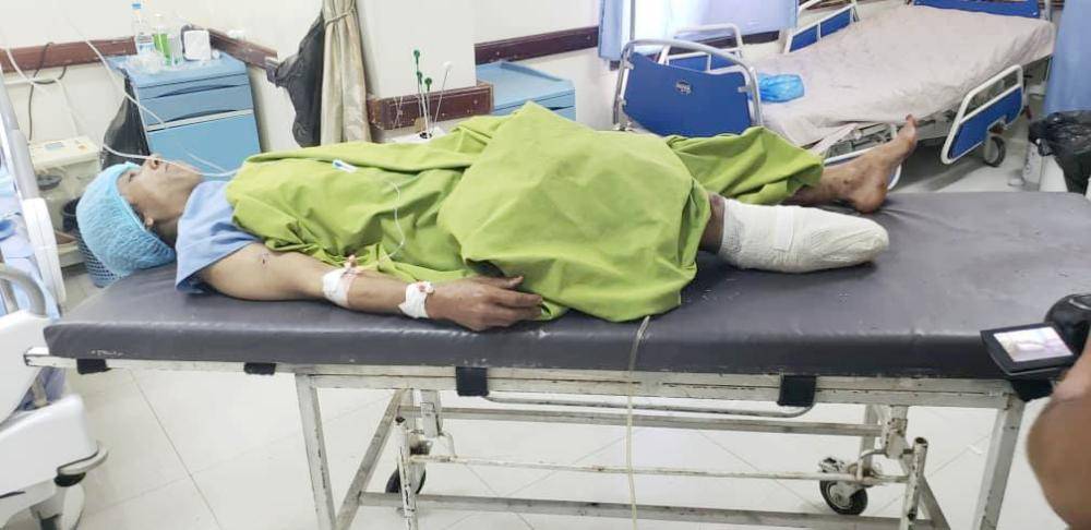 اليمنية فاطمة (45 عاماً) ترقد في مستشفى بتعز بعد أن فقدت قدمها في انفجار لغم حوثي. (تصوير: عامر العامري)