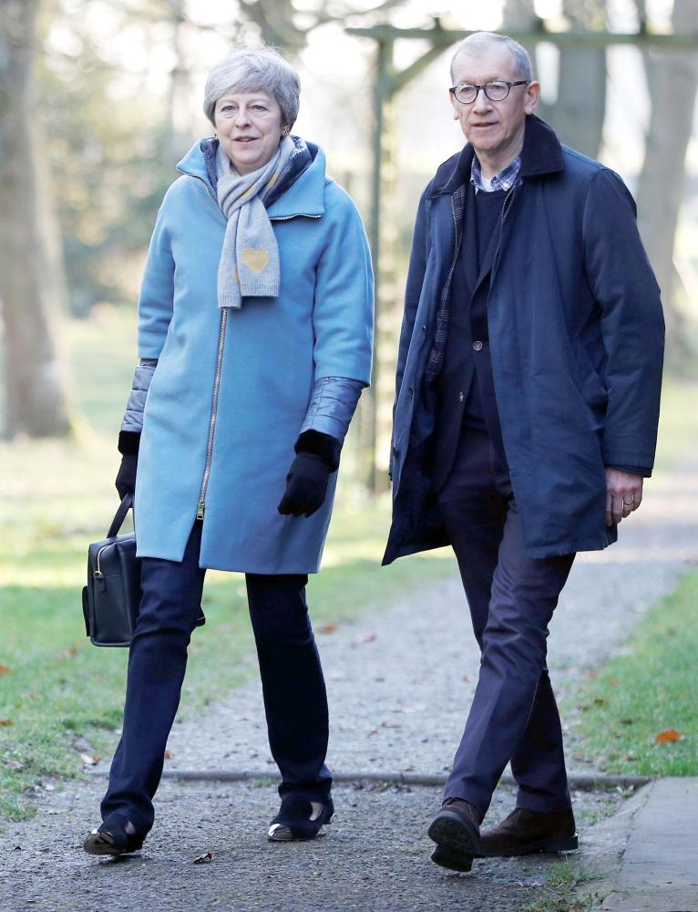 ماي وزوجها فيليب يغادران الكنيسة بالقرب من هاي ويكومب أمس. (رويترز)