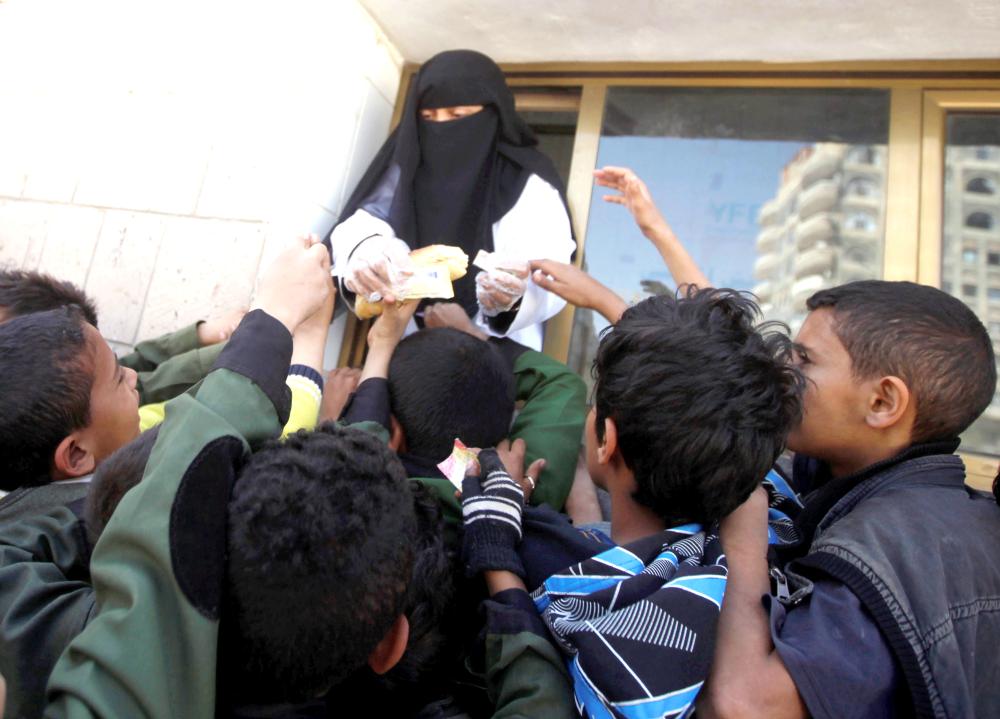 أطفال يمنيون يتجمعون أمام مدرسة للحصول على وجبة غذائية في صنعاء أمس. (رويترز)