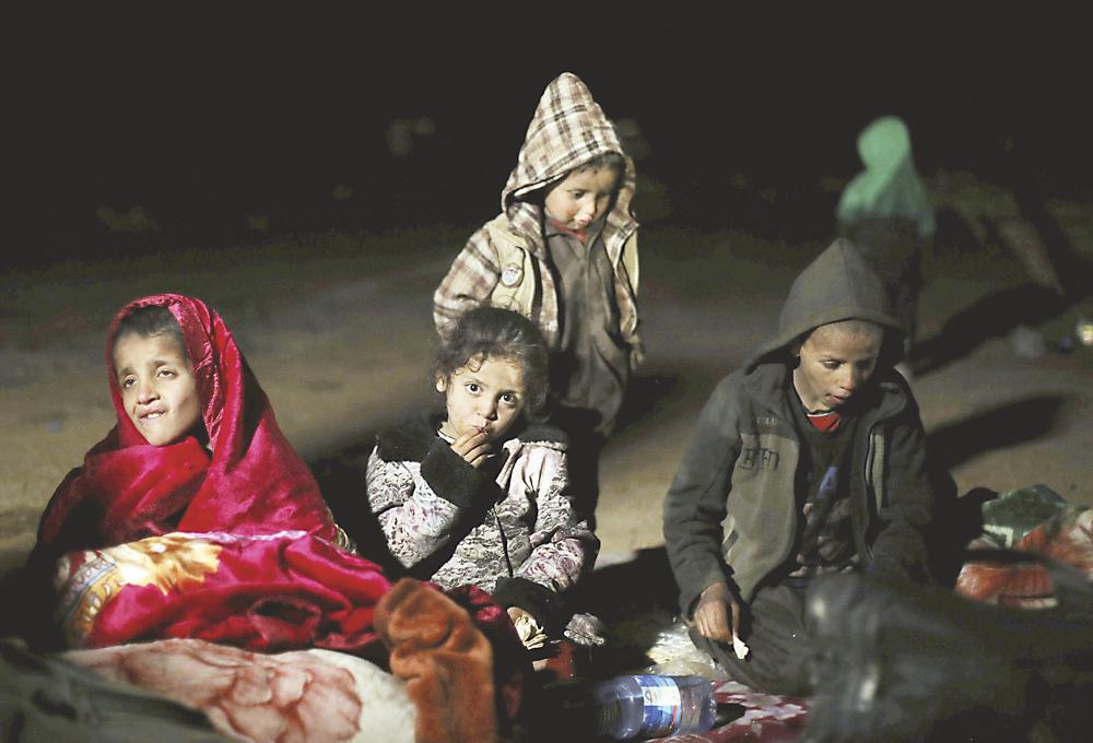 أطفال سوريون يجلسون بالقرب من قرية الباغوز أمس الأول بانتظار ترحيلهم إلى مخيمات النازحين. (رويترز)