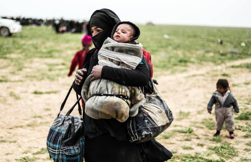 امرأة تحمل طفلها خلال ترحيلها من الباغوز إلى مخيمات النازحين أمس. (أ.ف.ب)