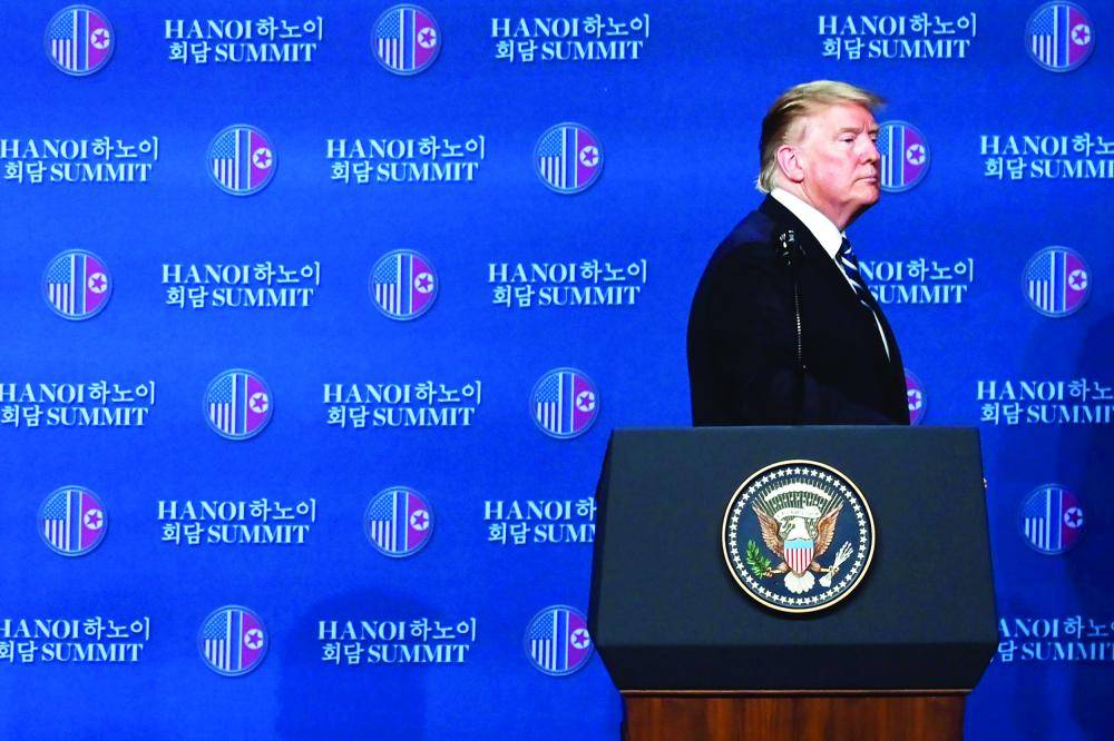 ترمب أثناء مغادرة المؤتمر الصحفي بعد لقائه مع كيم في هانوي، أمس (رويترز)