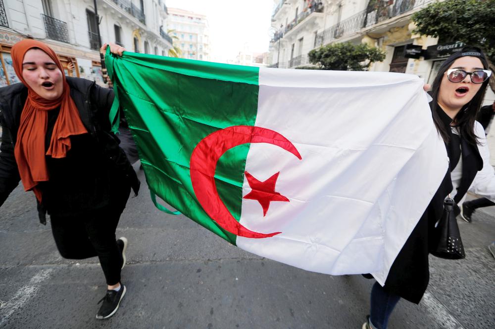 طالبات يرفعن علم الجزائر خلال مظاهرة احتجاجية ضد ترشح الرئيس بوتفليقة لولاية خامسة. (رويترز)