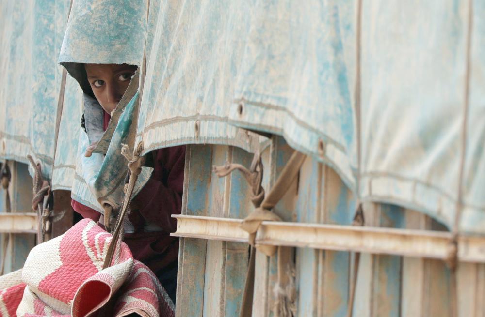 طفل سوري في شاحنة لنقله من الباغوز إلى أحد مخيمات النازحين. (رويترز)