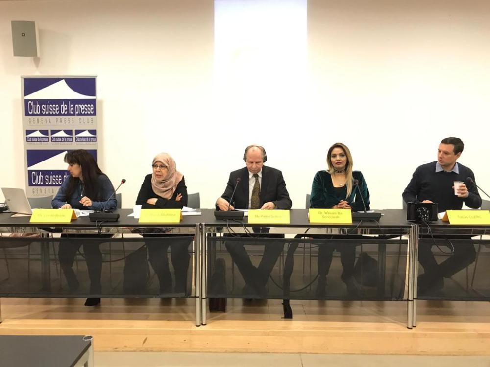 المتحدثون في ندوة نادي الصحافة السويسري. (عكاظ)
