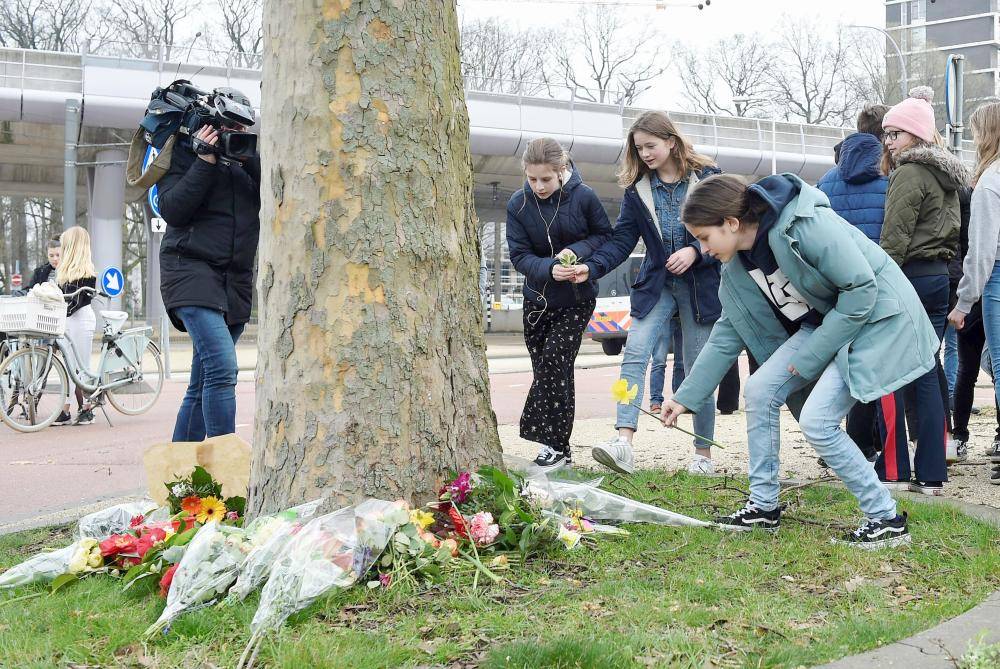 فتيات يضعن زهورا في موقع إطلاق النار في أوتريخت أمس. (أ ف ب)