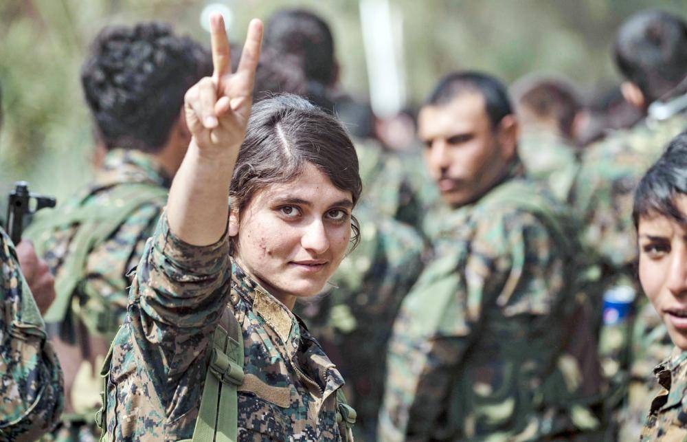 مقاتلة من قوات سورية الديمقراطية ترفع علامة النصر أثناء الاحتفال بهزيمة «داعش» وتحرير الباغوز أمس. (أ ف ب)