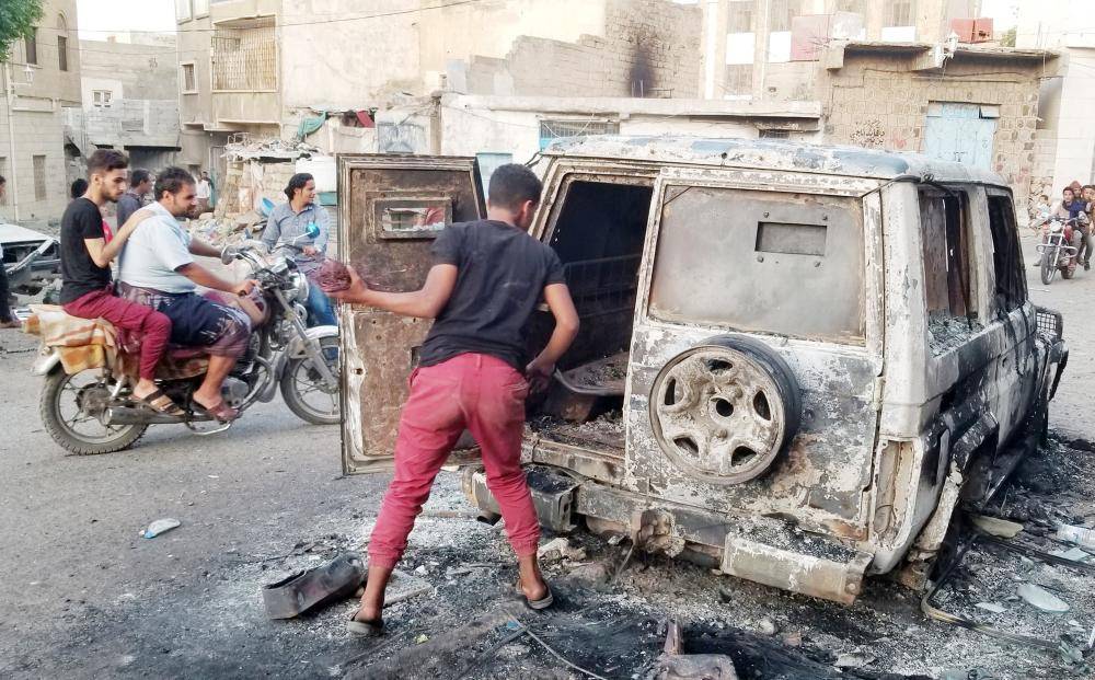 رجل ينظر إلى سيارة محترقة في مدينة تعز، بعد مواجهات بين عناصر مسلحة شهدتها المدينة أمس. (أ ف ب)