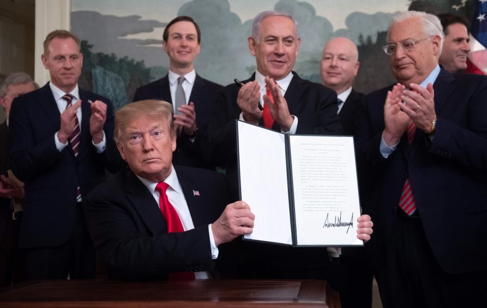 وقع الرئيس الأمريكي دونالد ترمب اليوم (الاثنين) مرسوماً يعترف بسيادة إسرائيل على هضبة الجولان التي احتلتها إسرائيل من سورية في حرب عام 1967.