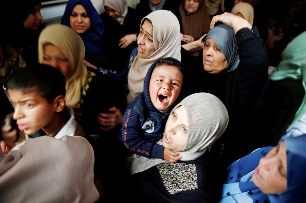 طفل فلسطيني يبكي أثناء تشييع جثمان محمد سعيد الذي قتلته إسرائيل على الحدود مع غزة أمس. (رويترز)