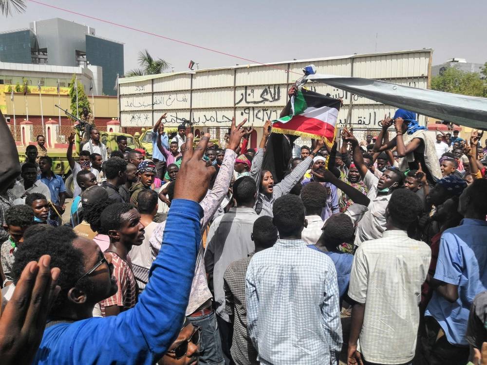 Sudanese protesters chant slogans as they rally for a fifth day in front of the military headquarters in the capital Khartoum on April 10, 2019. Thousands of protesters have been camping outside the military complex housing Bashir's official residence in Khartoum since April 6, braving tear gas and deadly gun shots from security services in defiance of a state of emergency banning all such demonstrations. The army, which has steered clear of intervening in the clashes since the start of the anti-government protests in December, has so far stood on the sidelines. / AFP / -
