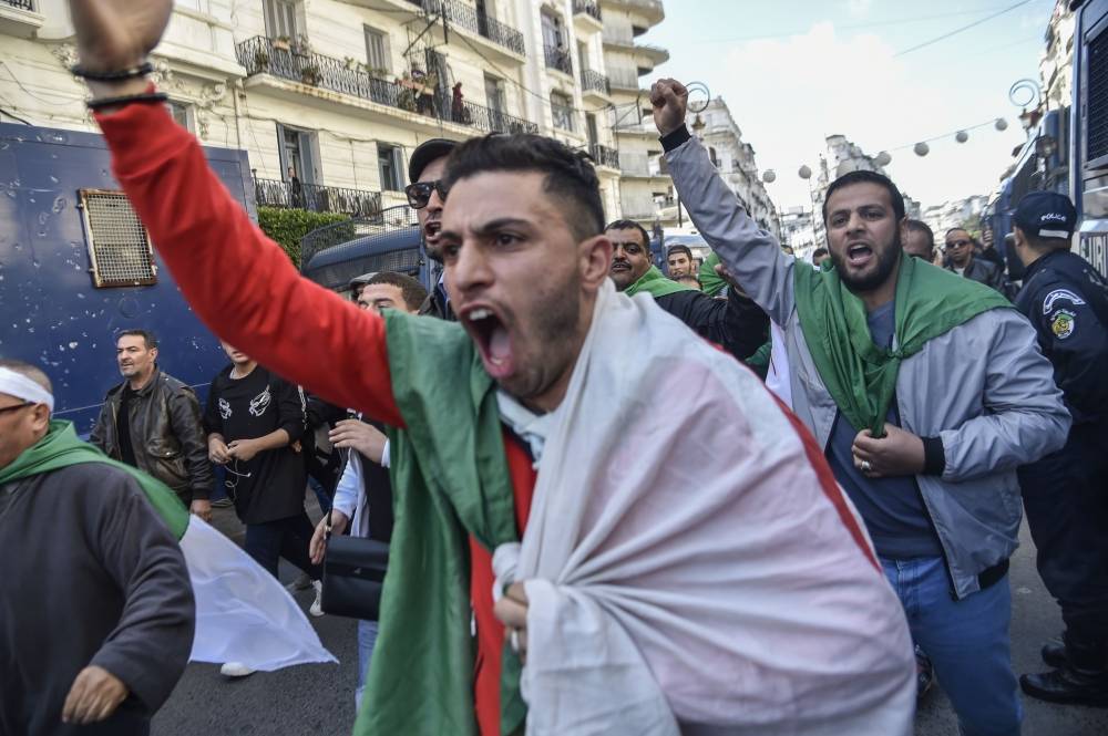 Algerian protesters shout slogans during an anti-system demonstration in the capital Algiers on April 10, 2019, one day after Algerian lawmakers appointed regime stalwart Abdelkader Bensalah as the country's interim president, dismaying protesters seeking sweeping change following the resignation of veteran leader Abdelaziz Bouteflika. Bensalah is a seasoned establishment insider who has a track record of stepping in for his veteran predecessor. / AFP / RYAD KRAMDI