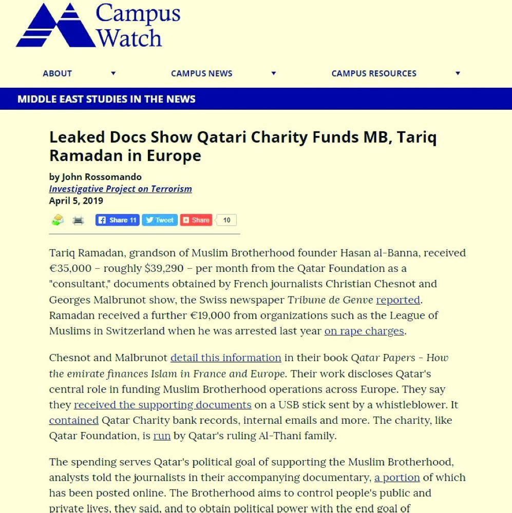 كشف موقع «كامبوس ووتش» الأمريكي عن تلقي طارق رمضان، حفيد مؤسس جماعة الإخوان حسن البنا نحو 39290 دولارا راتبا شهريا من مؤسسة «قطر الخيرية» للعمل معها كمستشار. ومن خلال وثائق حصل عليها الصحفيان الفرنسيان «كريستيان شيسنو» و«جورج مالبرونو»، من صحيفة «تريبيون دي جينيف السويسرية»، ذكرا أن رمضان تلقى 19 ألف يورو إضافية من منظمات مثل رابطة المسلمين في سويسرا عندما تم اعتقاله العام الماضي بتهمة الاغتصاب.