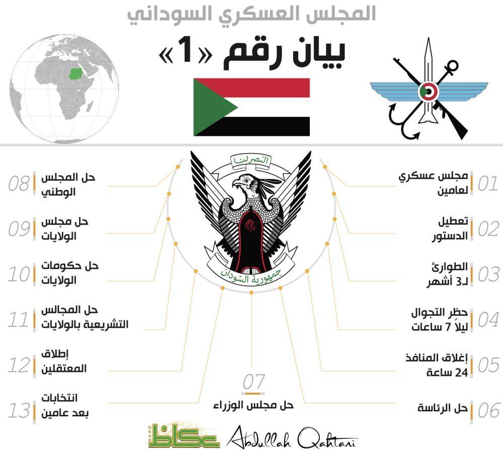 أعلن وزير الدفاع السوداني عوض بن عوف، اقتلاع نظام البشير والتحفظ على رأسه واعتقال الرئيس في مكان آمن، وتشكيل مجلس عسكري انتقالي لمدة عامين لإدارة البلاد مع تعطيل العمل بالدستور، وإعلان حالة الطوارئ لمدة 3 أشهر وحظر التجوال لمدة شهر. وقرر حل مؤسسة الرئاسة ومجلس الوزراء والمجلس الوطني وحكام الولايات ومجالسها التشريعية. وأكد البيان الذي تلاه أمس (الخميس) إغلاق الأجواء لمدة 24 ساعة، والمداخل والمعابر في كل أنحاء السودان لحين إشعار آخر. وأكد تأمين المؤسسات الحيوية والمرافق الحيوية والخدمات بكل أنواعها. وأكد إطلاق سراح كل المعتقلين السياسيين، وتهيئة المناخ للانتقال السلمي للسلطة وبناء الأحزاب السياسية وإجراء انتخابات حرة نزيهة بنهاية الفترة الانتقالية ووضع دستور دائم للبلاد. وقال إن اللجنة الأمنية العليا التي تدير الأزمة تتابع منذ فترة ما يجري في البلاد من سوء إدارة وفساد وانعدم الأمل في تساوي الفرص بين أبناء الشعب الواحد.ولفت إلى أن الشباب خرج في مظاهرات سلمية منذ 19 ديسمبر حتى الآن، في حين واصل النظام إصراره على المعالجة الأمنية، مقدما الاعتذار على سقوط الضحايا، ومشددا على إدارة الأزمة بكل كفاءة ومهنية. وقال عوف: «لقد تابعتم المظاهرات قرب مقر القيادة العامة للجيش، وتمسك النظام بالمعالجة الأمنية التي كانت تنذر بخسائر لا يعلم مداها إلا الله».واتهم النظام بسوء الإدارة وفساد النظم وغياب العدل والوعود الكاذبة والإصرار علي المعالجة الأمنية دون غيرها.