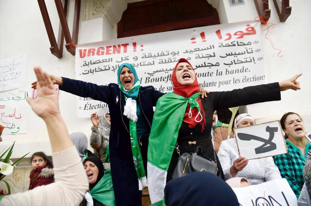 جزائريات يشاركن في المظاهرات المناهضة للحكومة في العاصمة الجزائر، أمس. (أ.ف.ب)