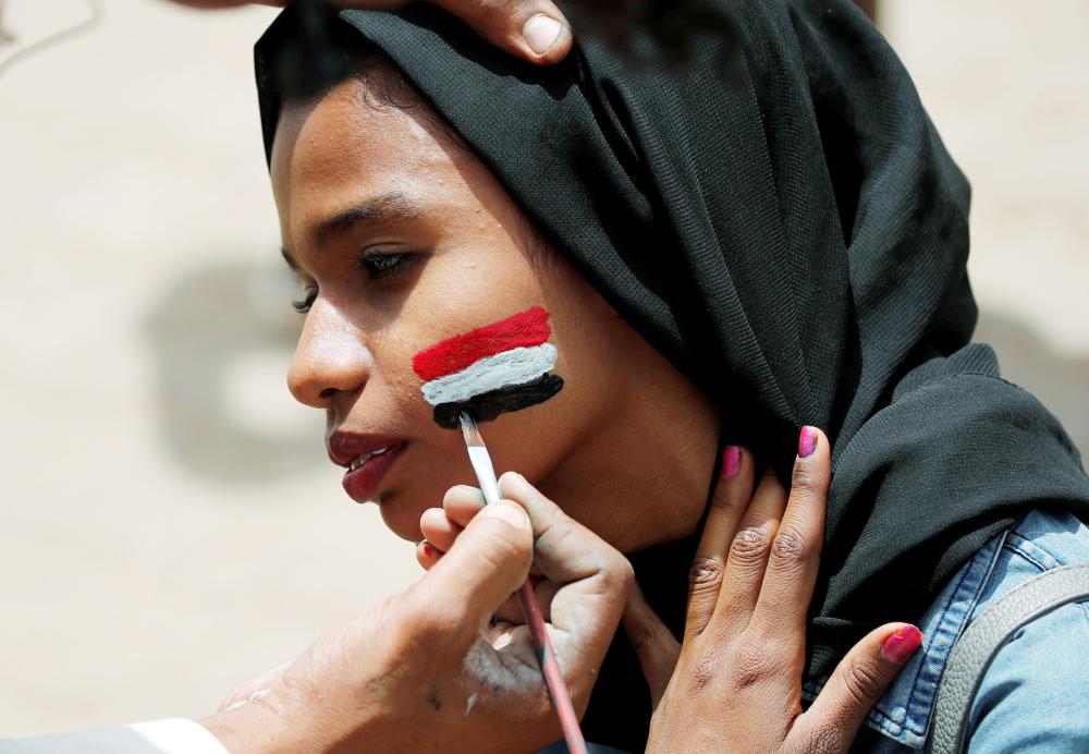 سودانية رسمت العلم الوطني على وجهها أثناء الاعتصام المتواصل أمام مقر وزارة الدفاع في العاصمة الخرطوم، أمس. (رويترز)