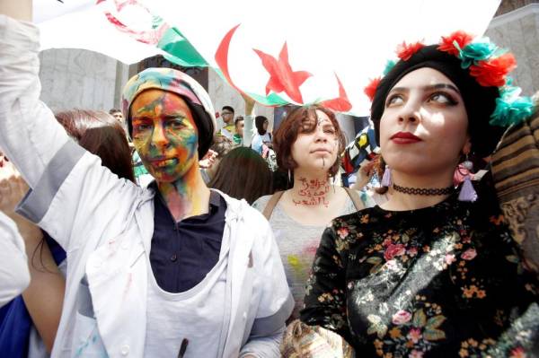 متظاهرات يحملن علم الجزائر خلال الاحتجاجات المناهضة للحكومة في العاصمة الجزائر، أمس الأول. (رويترز)