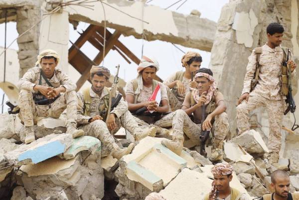جنود من قوات الشرعية فوق أنقاض مبنى خلال إطلاق البرنامج السعودي للتنمية وإعادة الإعمار في ميدي بحجة أخيراً. (أ ف ب)