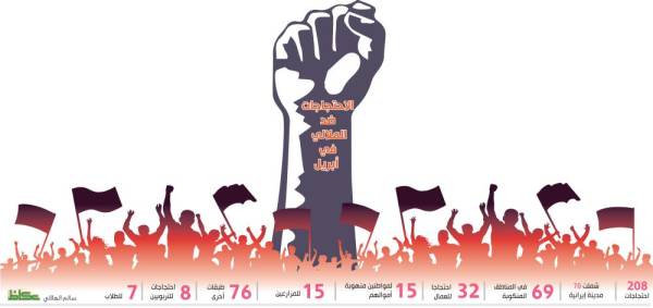 كشفت مصادر المعارضة الإيرانية أن نظام الملالي استنجد بمسلحين ومرتزقة لكبح الاحتجاحات المتواصلة، وسجلت منظمات تابعة للمقاومة الإيرانية خلال شهر أبريل نحو 208 احتجاجات زلزلت 70 مدينة إيرانية داخل البلاد، بواقع 7 حركات احتجاجية على الأقل يوميا.
