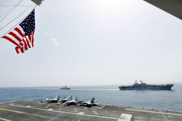 السفينة الحربية البرمائية التابعة للبحرية الأمريكية «يو إس إس كيرسارج»، ومدمرة الصواريخ الموجهة «يو إس إس بينبريدج» خلال إبحارها في بحر العرب، أمس الأول، تجاه الخليج العربي. (رويترز)