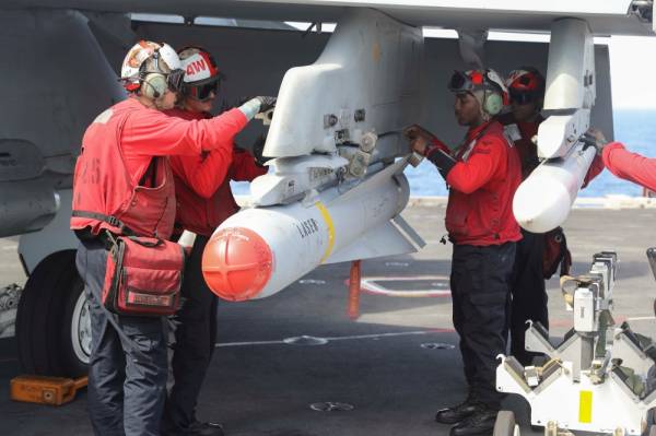 Flight dec crew remove ordnance from an F/A-18E Super Hornet on the flight deck of the aircraft carrier USS Abraham Lincoln (CVN 72), in Arabian Sea, May 22, 2019. Picture taken May 22, 2019. Matt Herbst/U.S. Navy/Handout via REUTERS ATTENTION EDITORS- THIS IMAGE HAS BEEN SUPPLIED BY A THIRD PARTY.