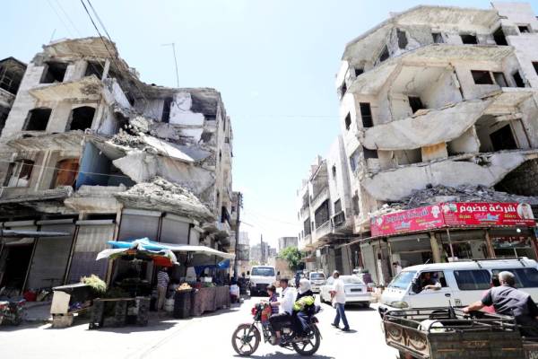 مبانٍ مدمرة في أحد شوارع مدينة إدلب كما بدت أمس. (رويترز)