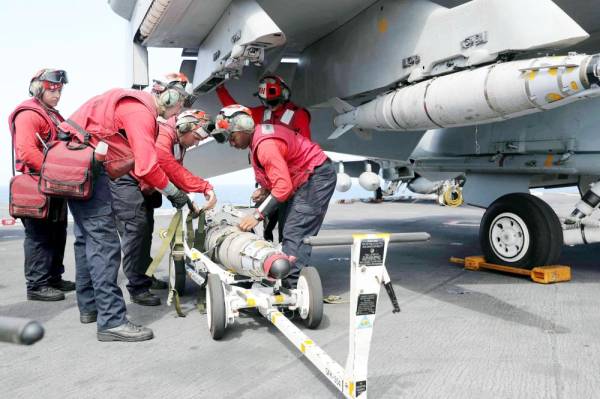 تجهيز الطائرات من طراز F / A-18E سوبر هورنيت بالذخائر على سطح حاملة الطائرات «يو إس إس أبراهام لنكولن» في بحر العرب. (رويترز)