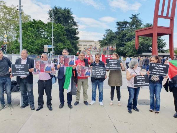 متظاهرون خلال وقفة احتجاجية أمام مقر الأمم المتحدة في جنيف تنديدا بجريمة تعذيب وقتل الفلسطيني زكي مبارك من قبل النظام التركي. (متداولة)