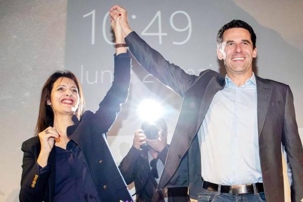 زكية خطابي (إلى اليسار) وإيكولو جان مارك (إلى اليمين) أثناء احتفال حزب الخضر في بروكسل أمس. (أ.ف.ب)