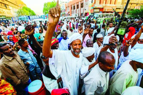 سودانيون مؤيدون للمجلس العسكري أثناء مظاهرة في وسط الخرطوم أمس الأول. (أ.ف.ب)