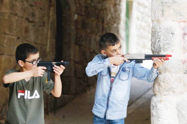 طفلان فلسطينيان يحملان أسلحة بلاستيكية مزيفة وهما يلعبان في مدينة الخليل أمس. (أ.ف.ب)