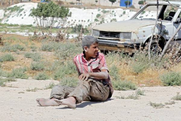 فتى سوري يجلس على الأرض بعد قصف على منطقة صناعية في إدلب أمس. (أ ف ب)