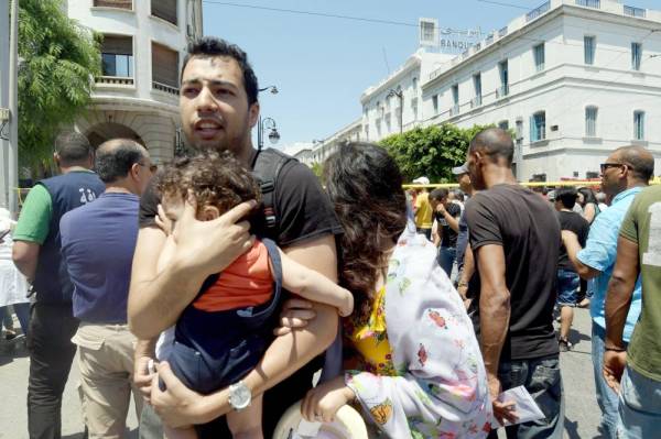 مدنيون يهرعون هرباً من موقع الهجوم الانتحاري في شارع الحبيب بورقيبة الرئيسي بالعاصمة التونسية صباح أمس. (أ.ف.ب)
